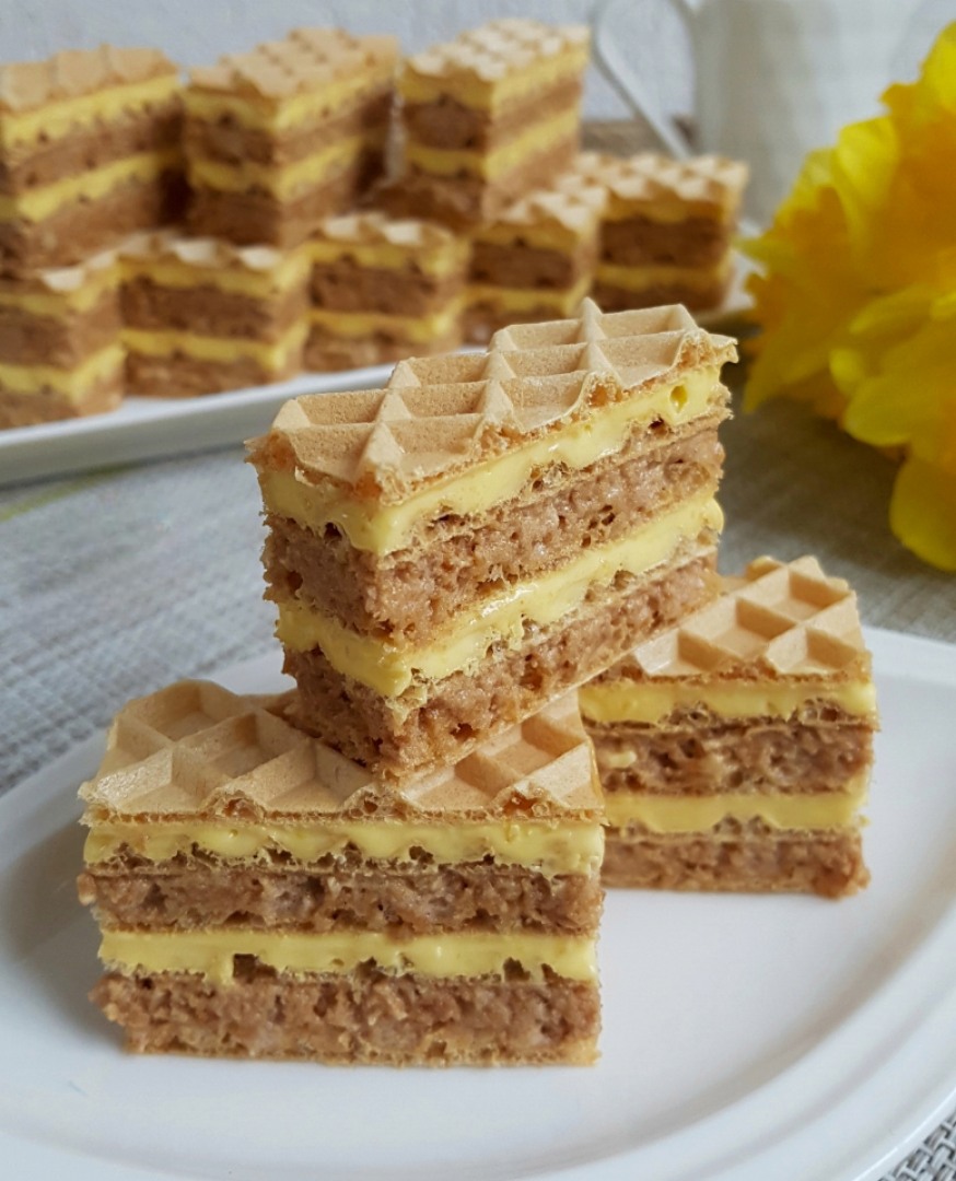 Dacă iubești prăjiturile cu aer elegant, dar care nu îți dau bătăi de cap în bucătărie, aceste napolitane cu două tipuri de cremă – una fină, din gălbenuș, și alta bogată, cu bezea, cacao și biscuiți – sunt exact desertul de care ai nevoie. Straturile frumos așezate și textura care se topește în gură le fac perfecte pentru mesele festive, dar și pentru un răsfăț dulce în weekend.
