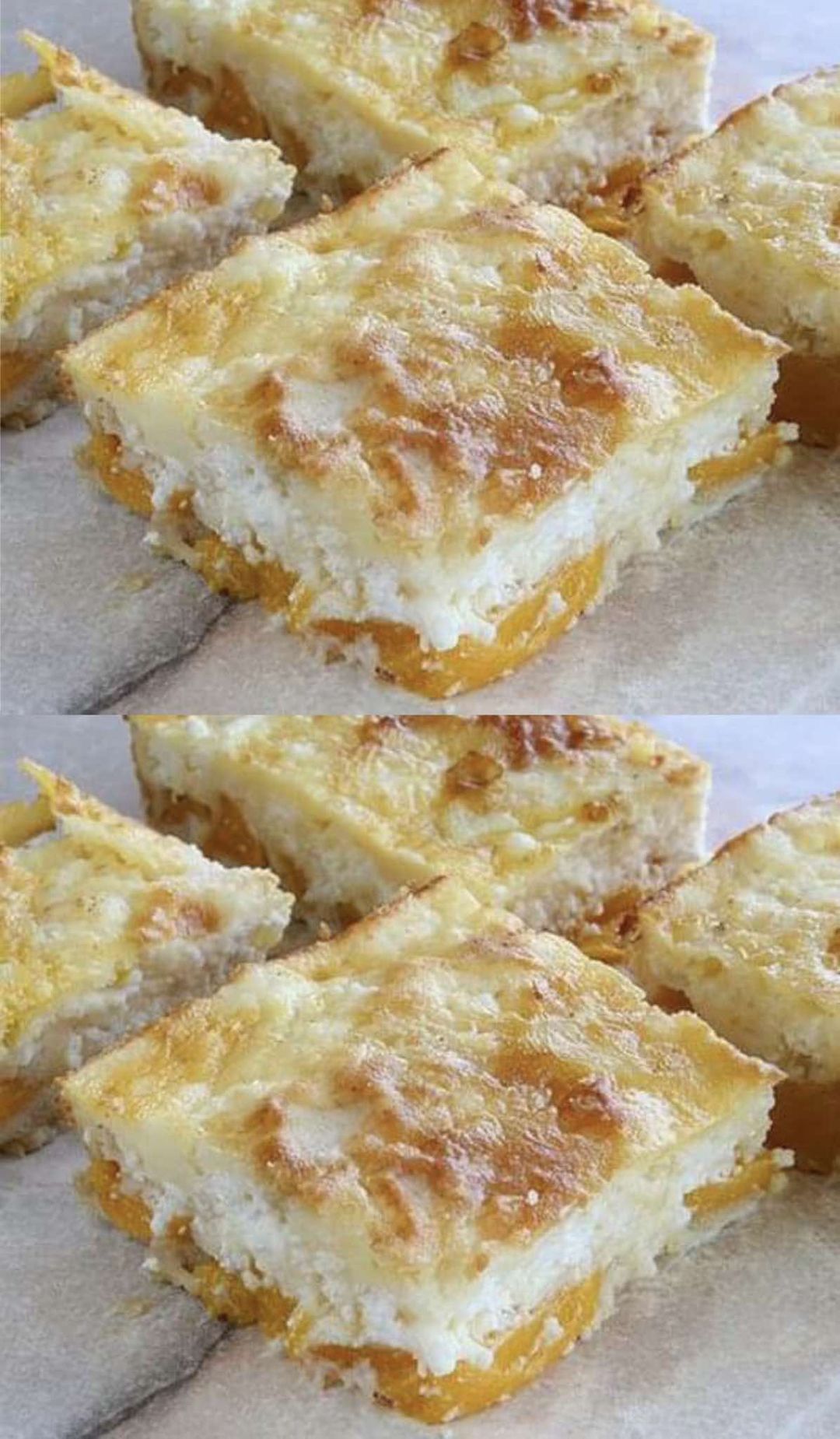 - Stratul de brânză: Brânza de vaci amestecată cu zahărul vanilat se distribuie uniform peste fructe.